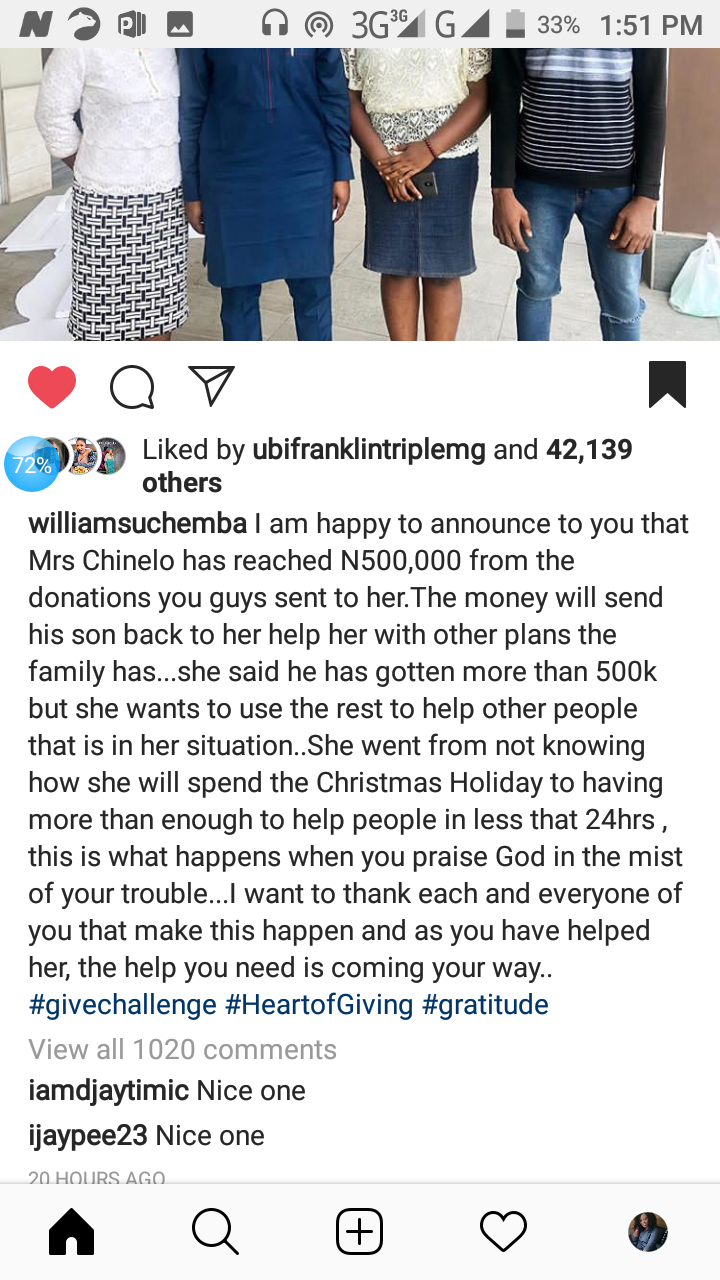 Apparently, Mrs. Chinelo asked for a bag of rice but within 24 hours after Williams posted her request on his instagram page, she realized above N500,000. The woman and her children were very grateful to Williams and his fans who donated to help them.